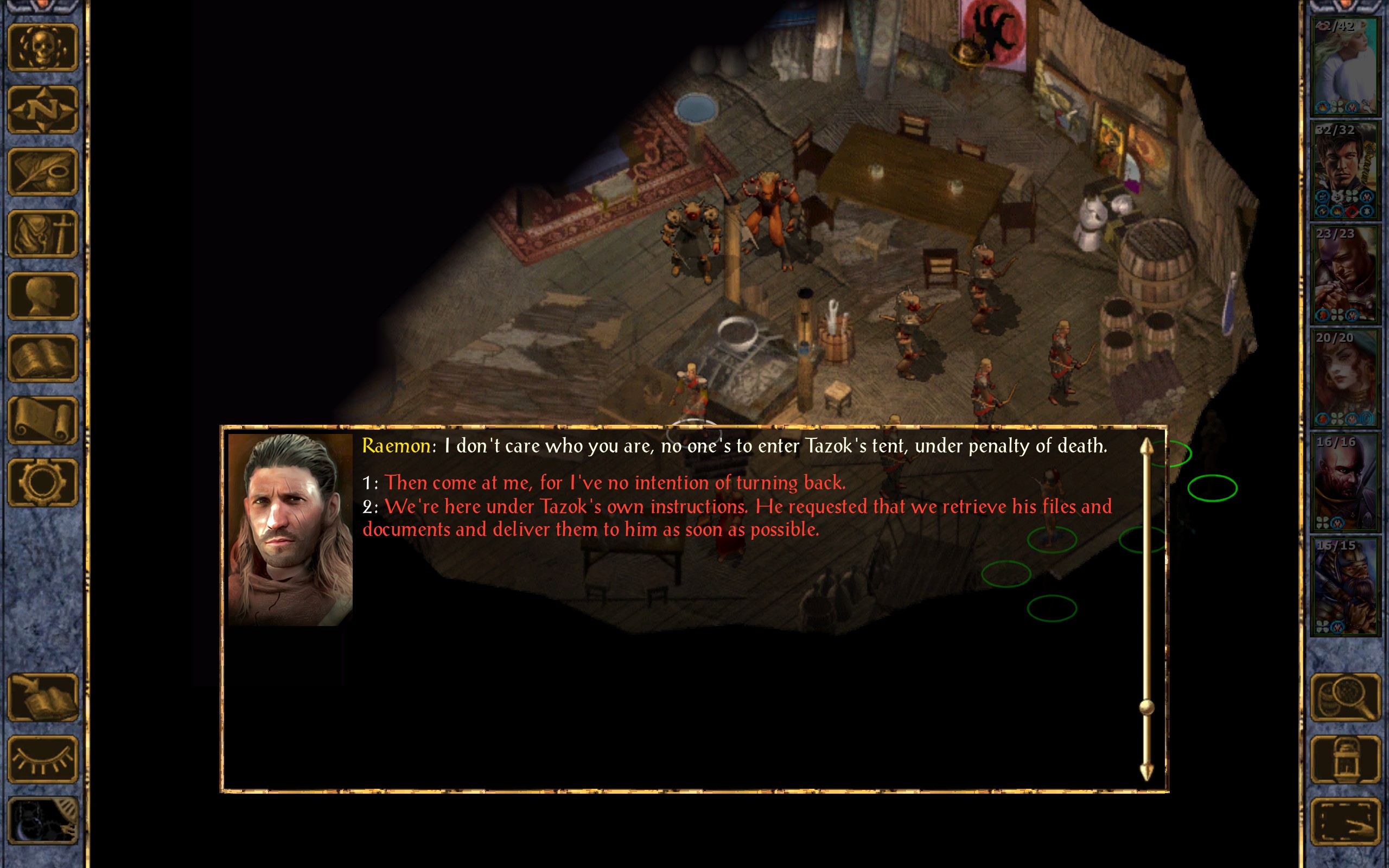 Ender Sai: That’s the trick, see? Crush and Taurgosz Khosann, leader of the Blacktalons, both think he’s getting orders from the Zhents, and Tazok doesn’t do much to discourage that partuicular line of thinking. But the Blacktalons and the Chill are bandit groups, see? They ply the trade routes, avoid the cities, and that’s where they go wrong. I’m from the Gate, and I can tell you dead as leather that the Zhentarim aren’t behind this.