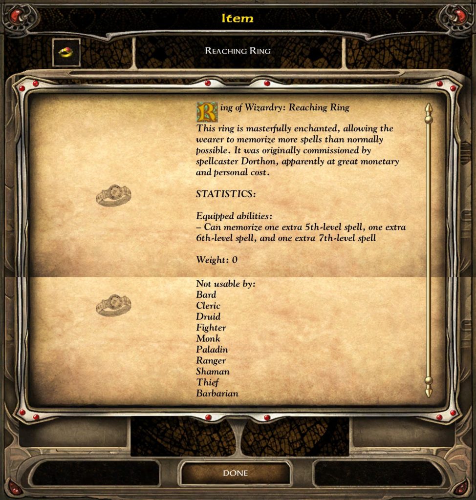 The ring we picked up is known as a Reaching Ring. It was apparently commissioned by a spellcaster who shares a name with me.