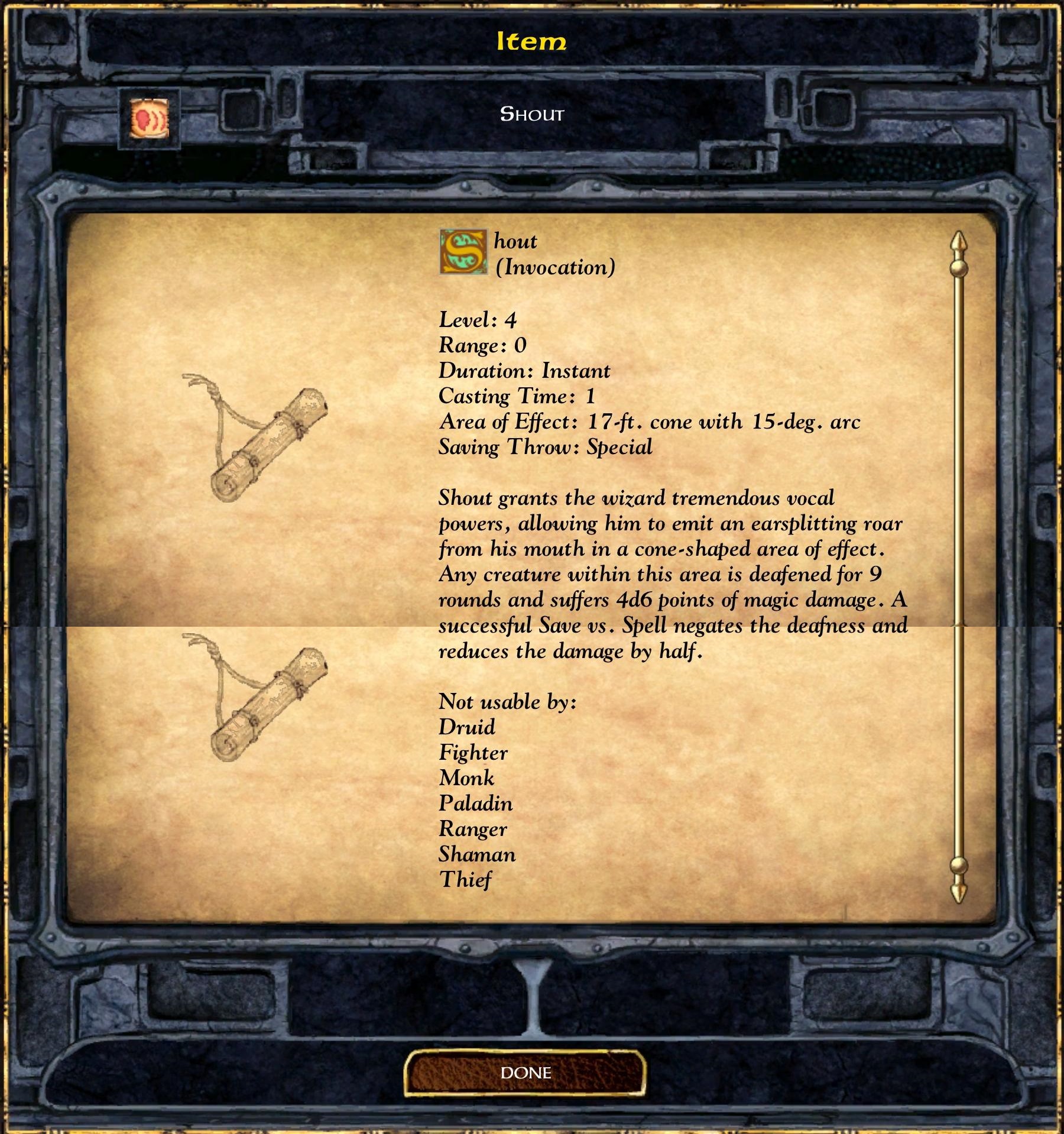 The next scroll simply allows the caster to shout really loud. Loud enough to burst someone’s ear drums.