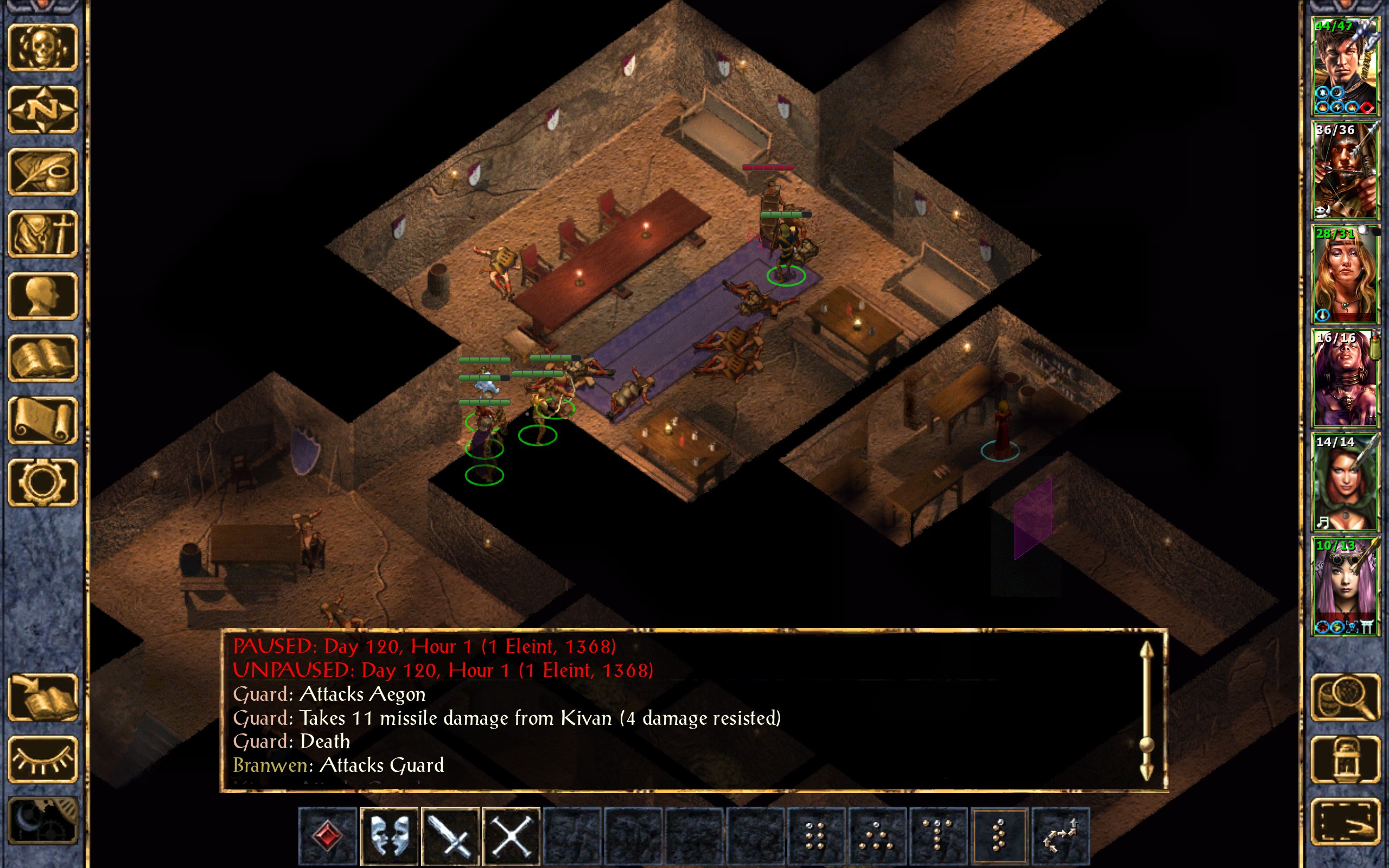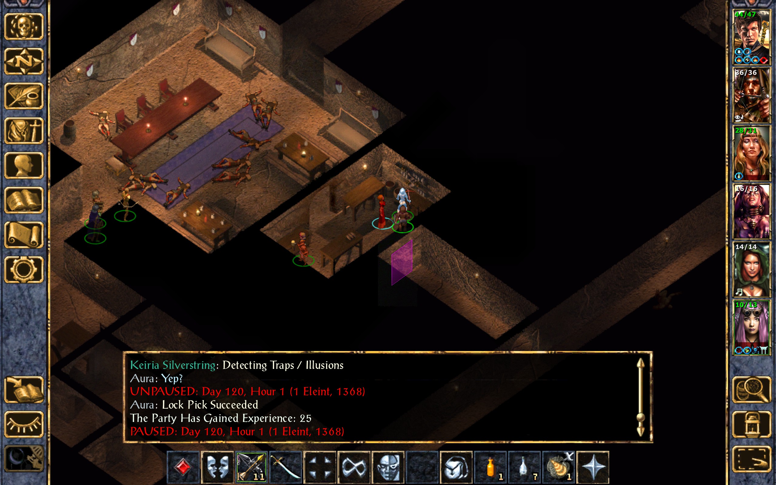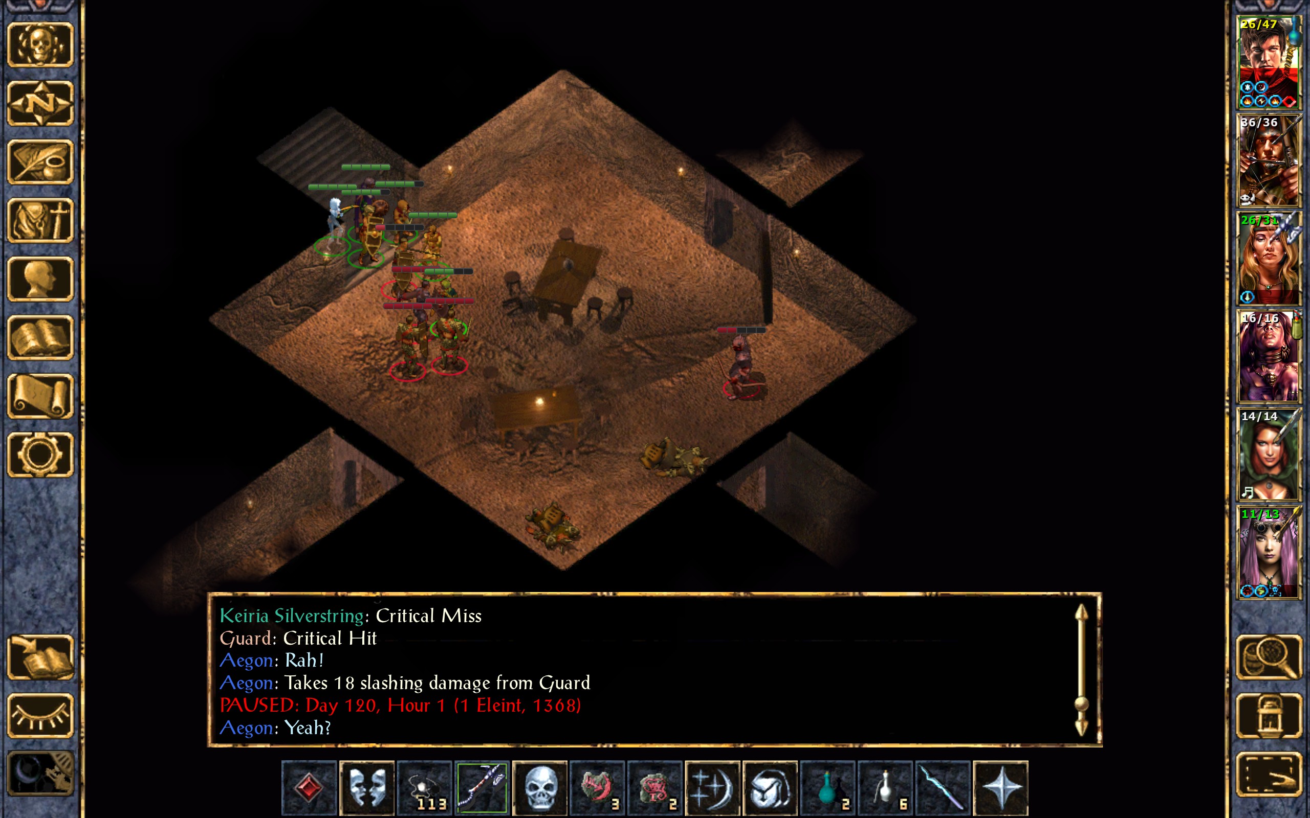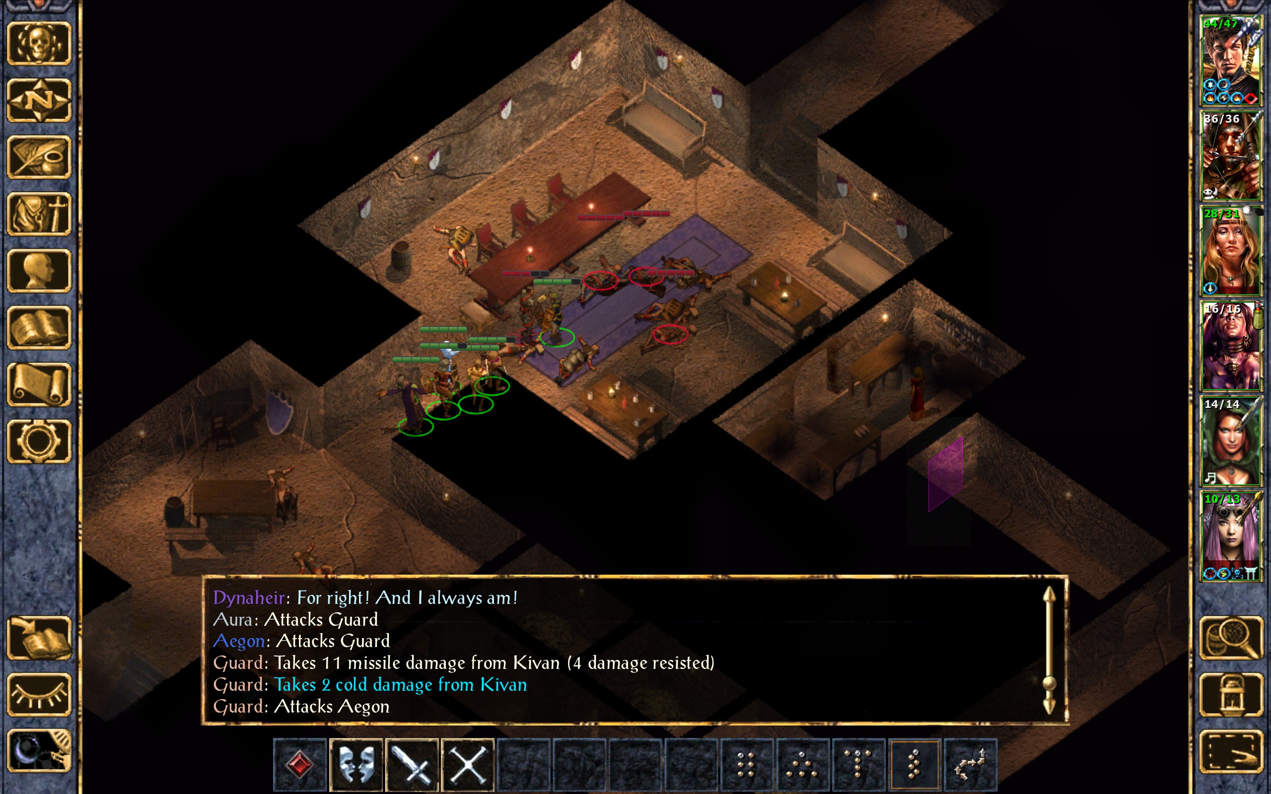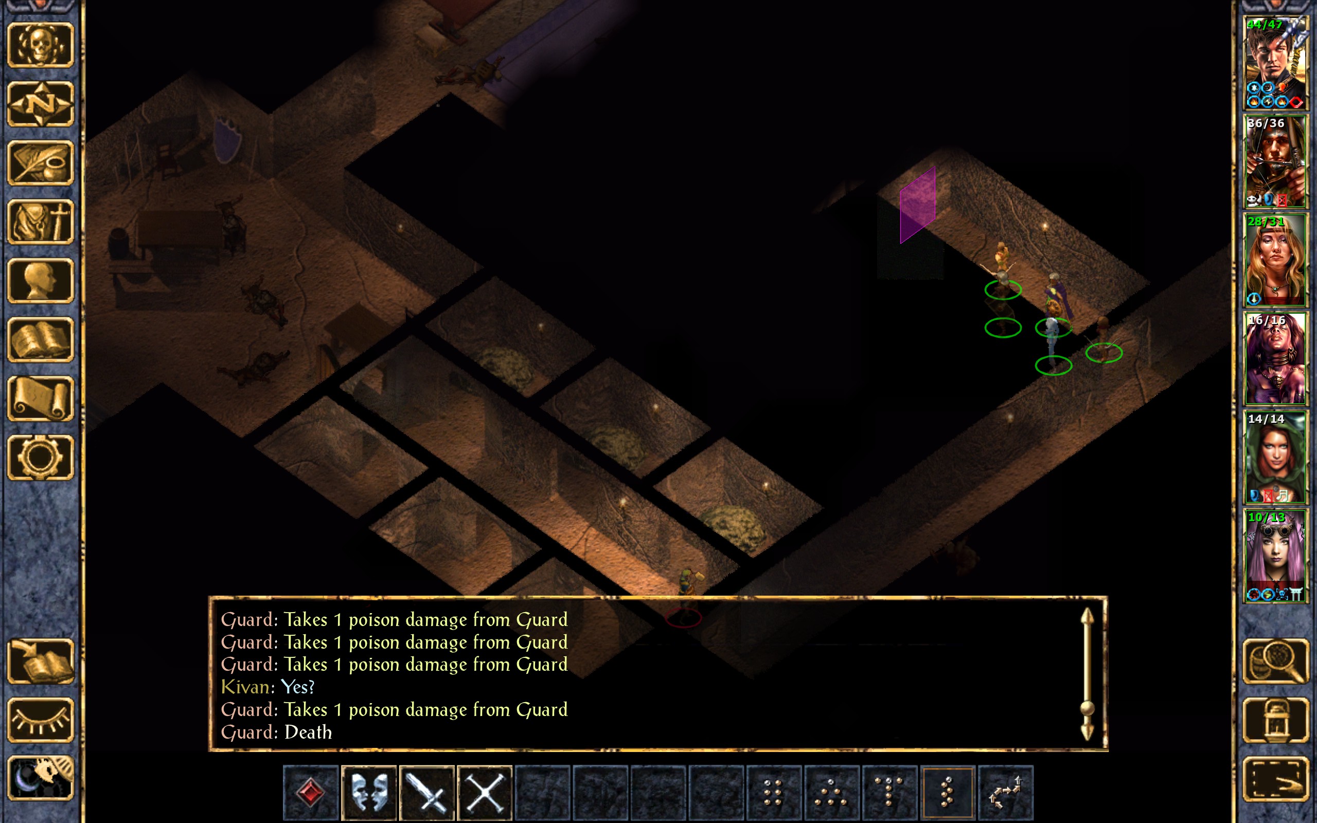 The others turn the corner, glad to see that I am back. Dynaheir says we should move quickly, rush the mage. He must not be allowed to cast another spell. We charge back into the western room and find the mage on his own. His guard must still be in the main guardroom to the north. He still has some protective spells active, but no matter how he tries, a blow from Bashrik’s hammer or an arrow sticking in him distracts him enough to counter his magic.