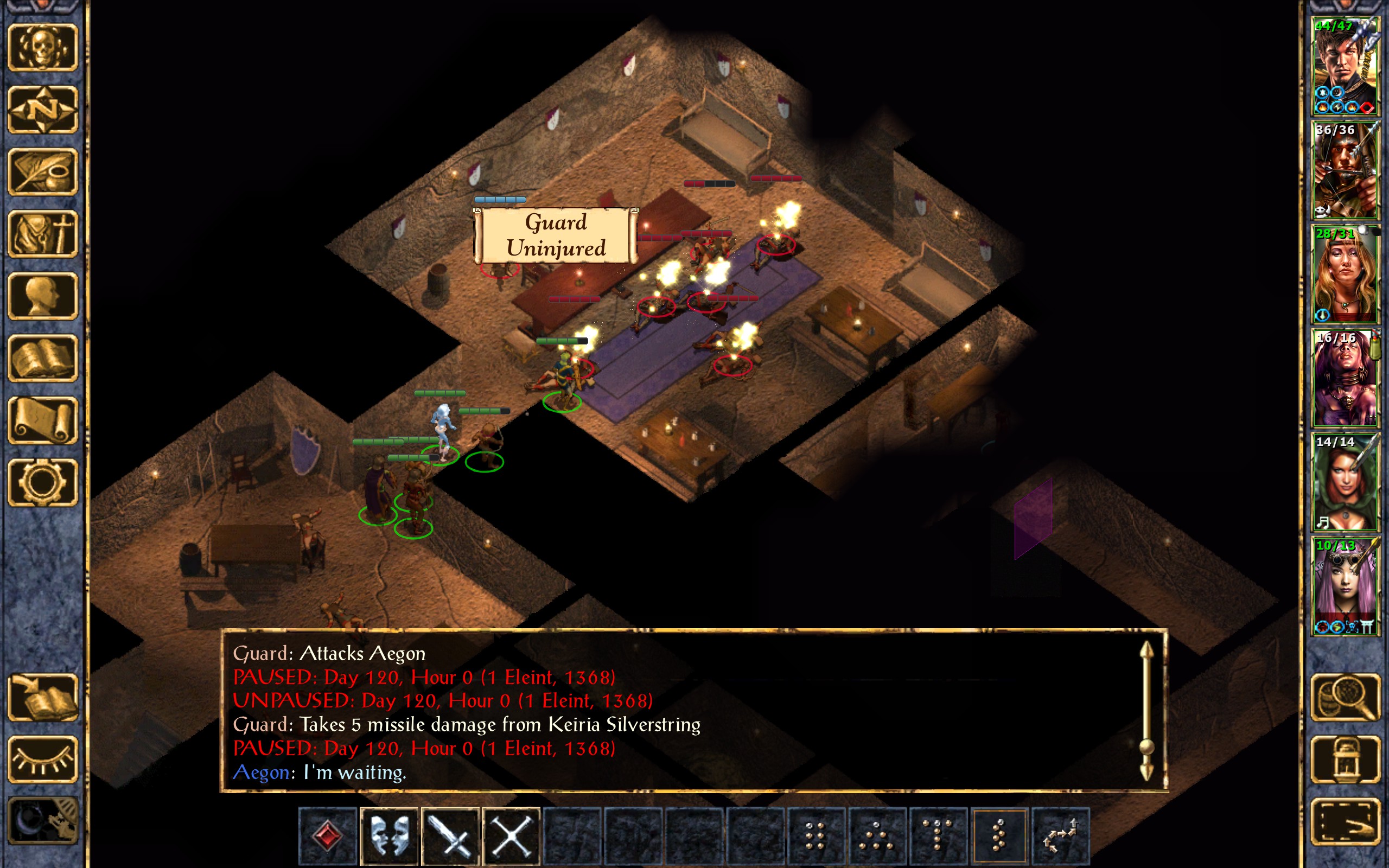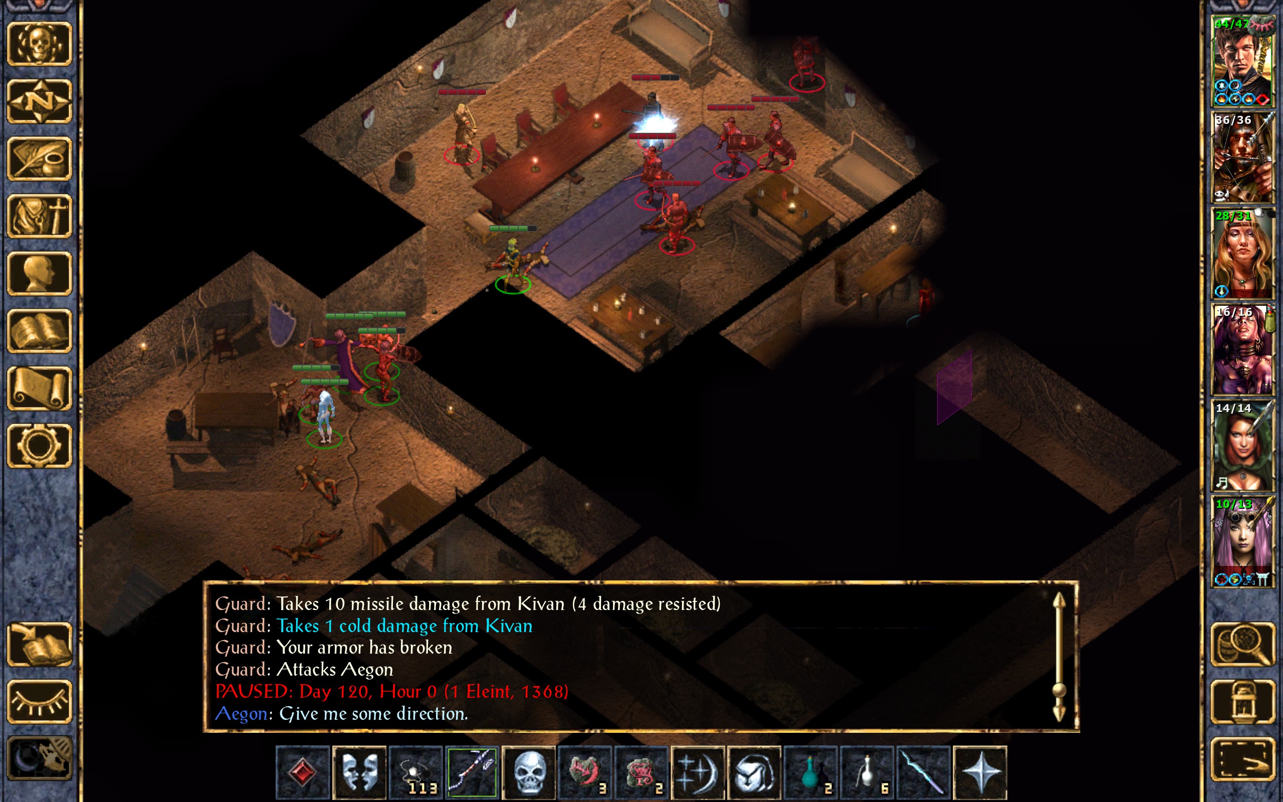 There is no more noise coming from the guardroom. It’s almost too quiet. The small corridor leading to it is strewn with bodies, many with arrows sticking out of them. We step over them and find the surviving guards standing around a corpse in the middle of the room. They look to us with fear and anger. Kivan fires an Arrow of Ice that hits one of the guards so hard his armour freezes and shatters.