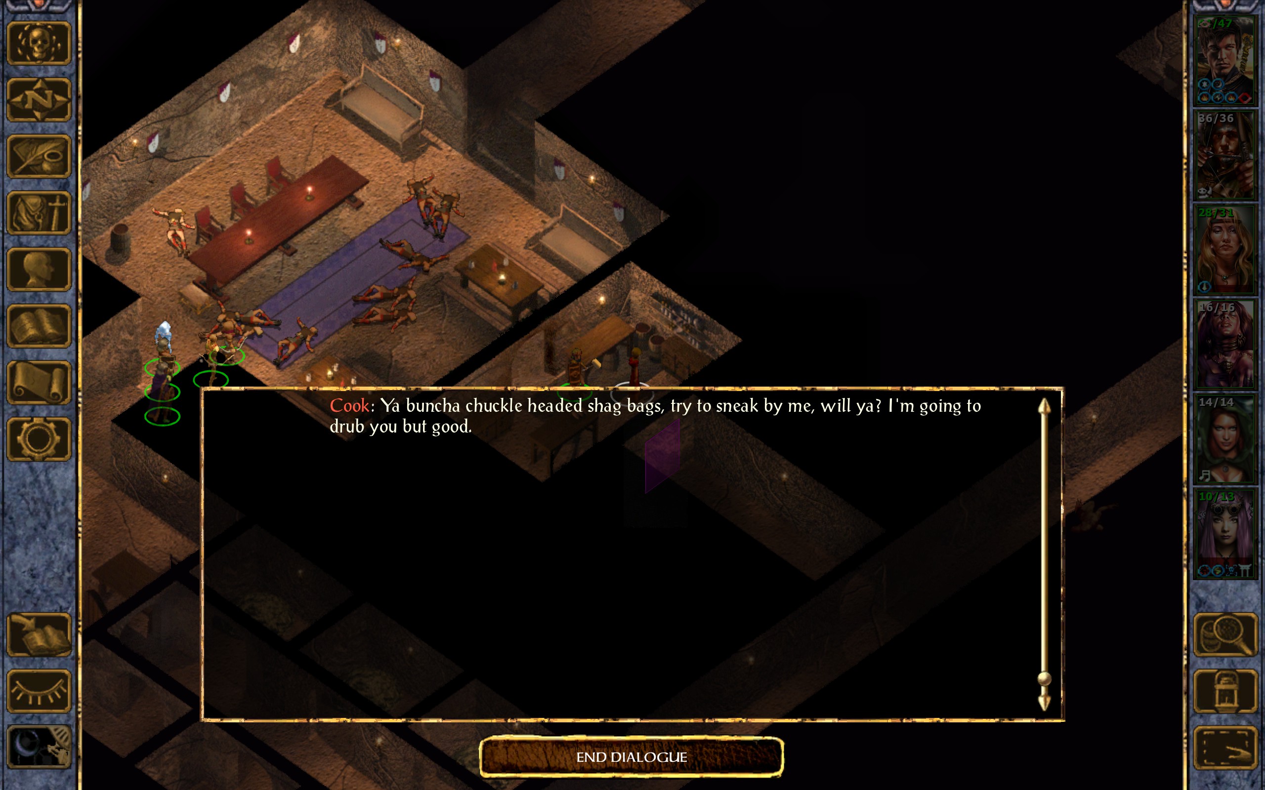 The guards were not well equipped. Most of them wore leather armour and carried long bows. We gather up what trinkets we can from the bodies. As we search them I wander into a room to the east that turns out to be a kitchen. The chef is not amused by our presence.