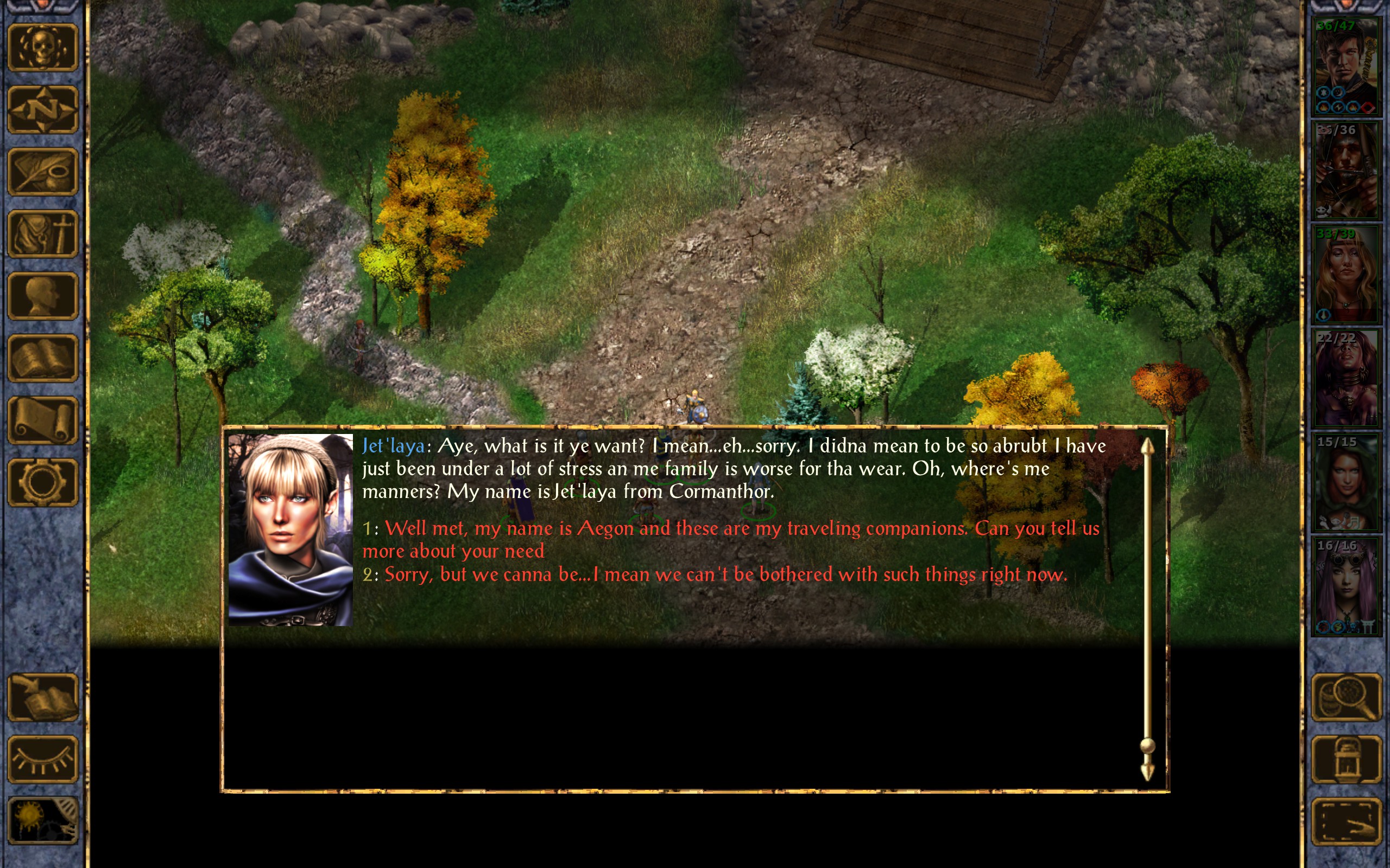 Jet’laya: Aye, what is it ye want? I mean…eh…sorry. I didna mean to be so abrubt I have just been under a lot of stress an me family is worse for tha wear. Oh, where’s me manners? My name is Jet’laya from Cormanthor.