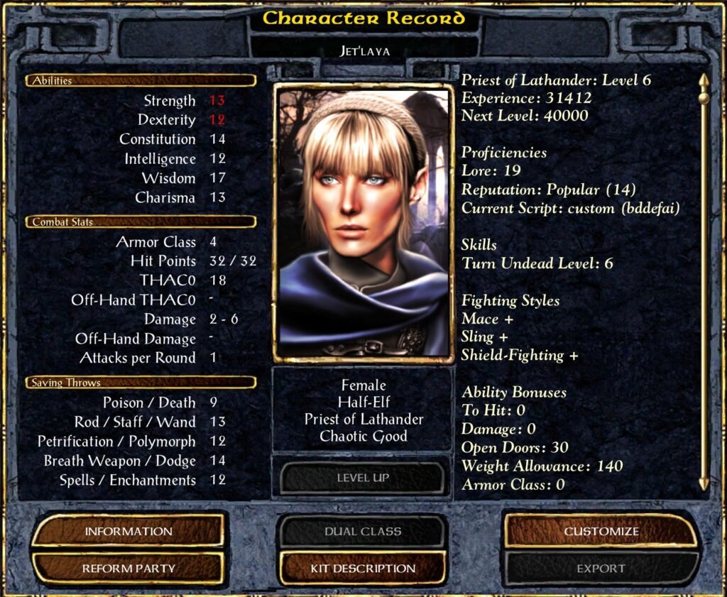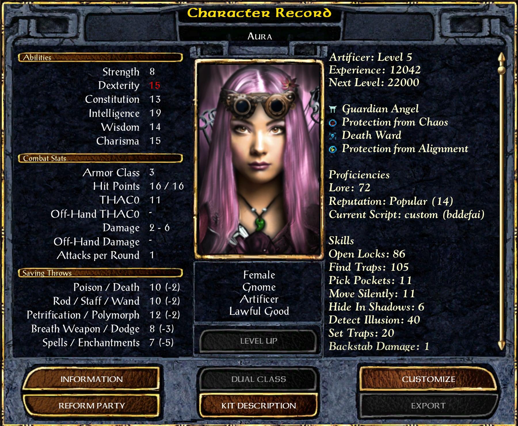Her Death and Wand Saving Throws improve by 1. Her THAC0 is reduced by 1. Her Backstab Multiplier is increased by 2. She gains 20 Skill Points and I put 10 into Open Locks and 10 into Find Traps. She gains 3 Hit Points and 3 points of Lore.