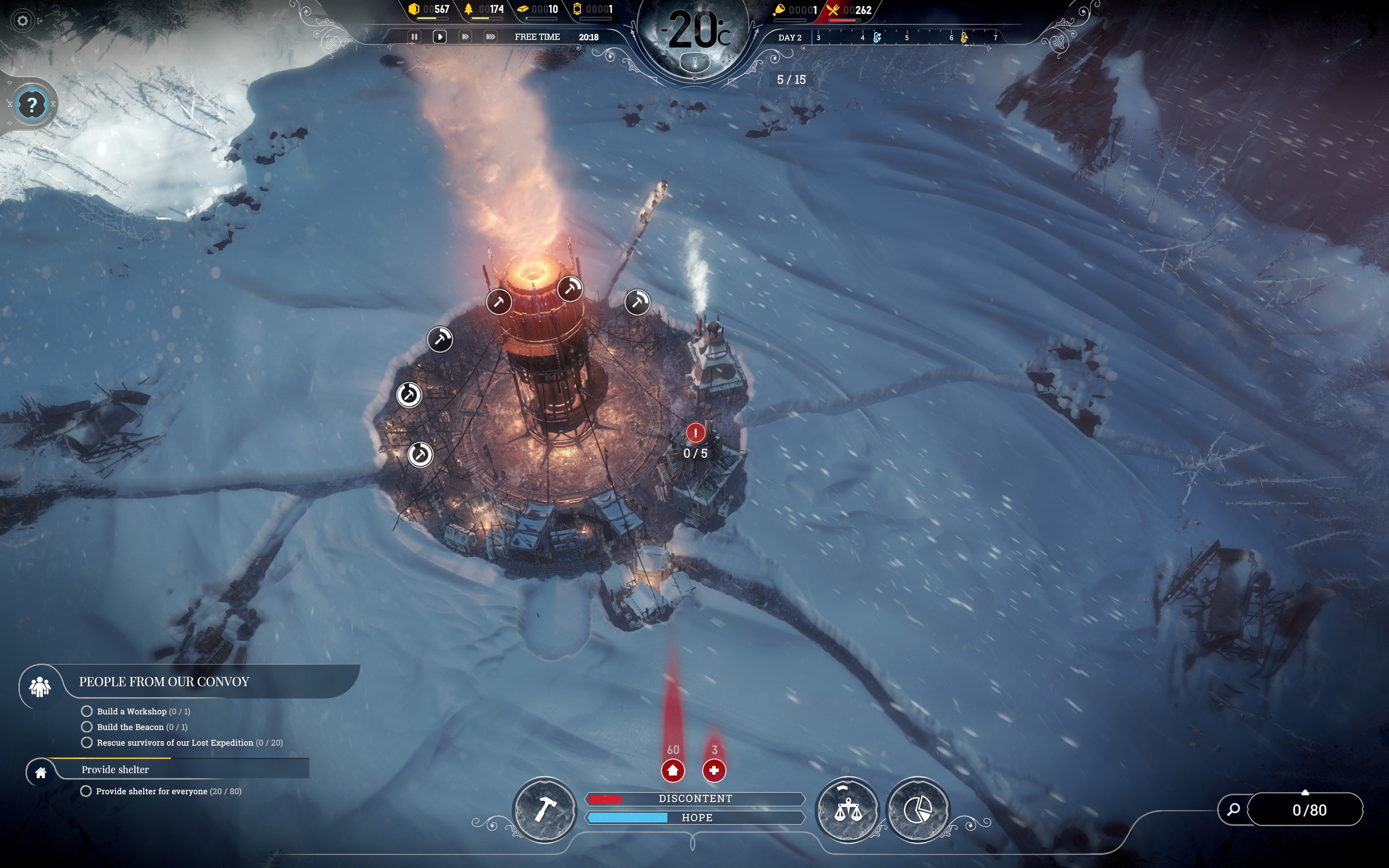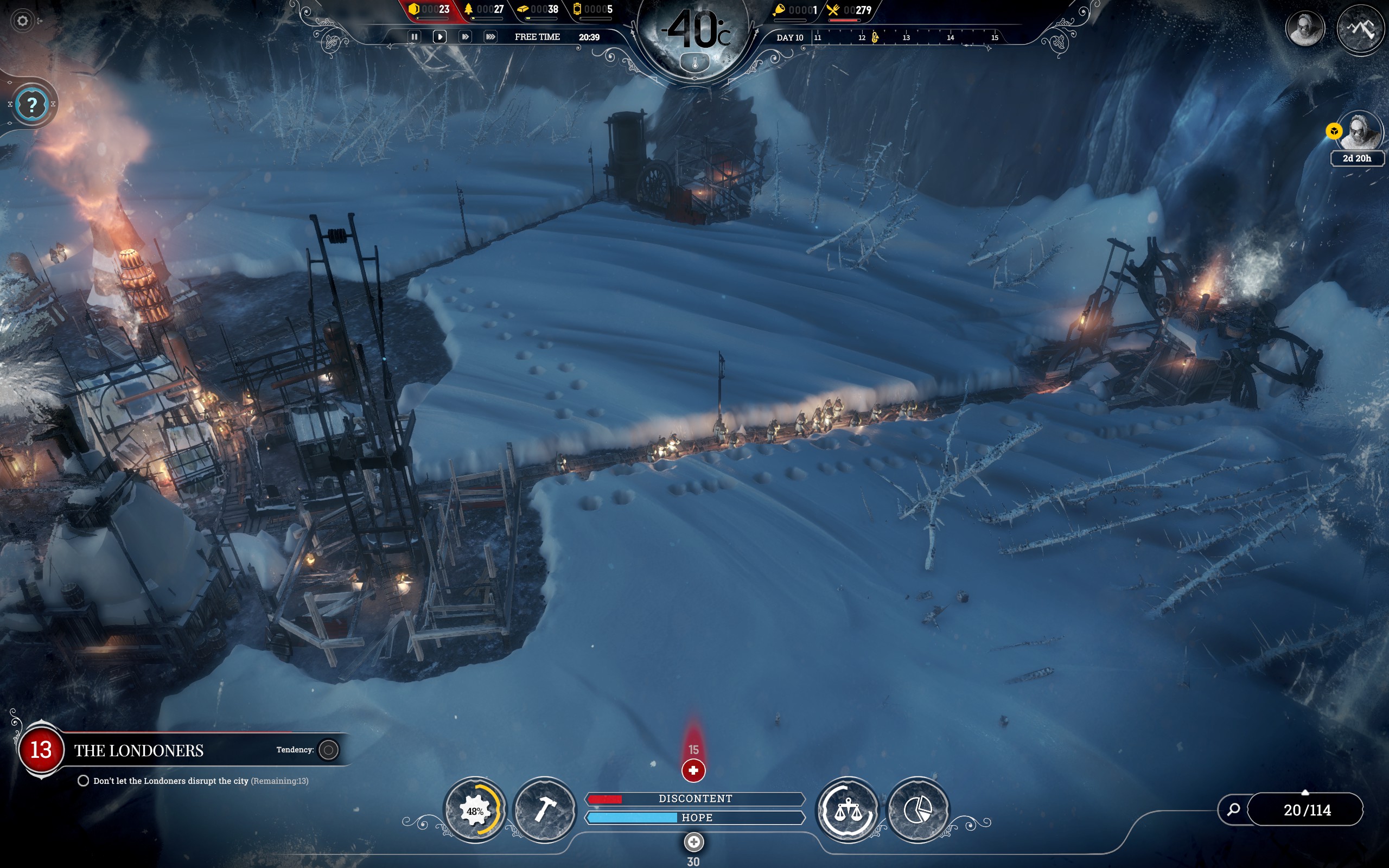 My second run is doing better. I managed to build up enough coal production to ensure people don’t freeze, have brought law and order to the city and sent expeditions out to gather resources. The expeditions are used to move the plot forward, but this time I was sure to do the optional expeditions first.