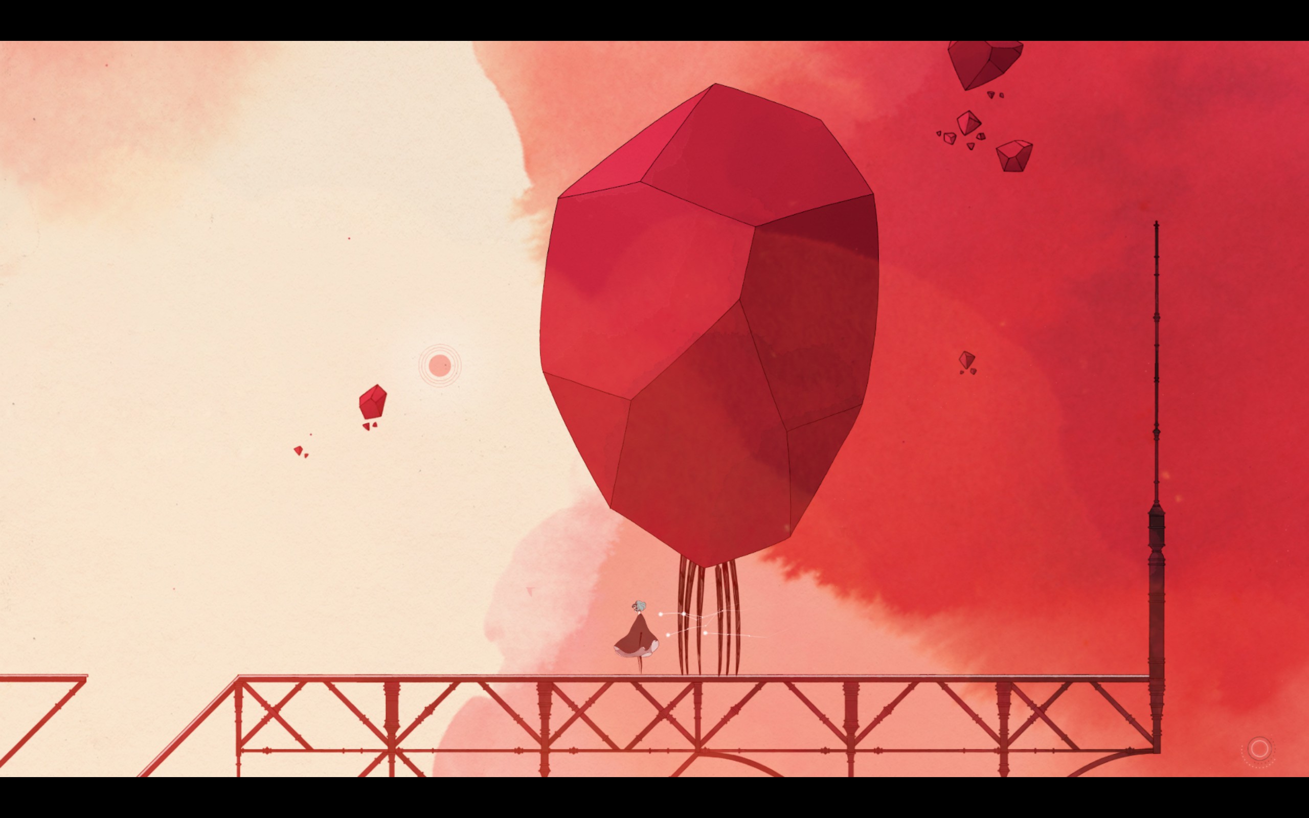 Eventually, with your guidance, Gris begins to emerge from her depression, choosing to move forward. She starts to run and jump. She finds a part of the statue she was singing to, broken and lifeless. She starts to float, lets out a silent scream and splashes of red fly out and start to fill the world. It made me think of blood at first, a violent rage. She is angry, and her anger is her determination to keep going.