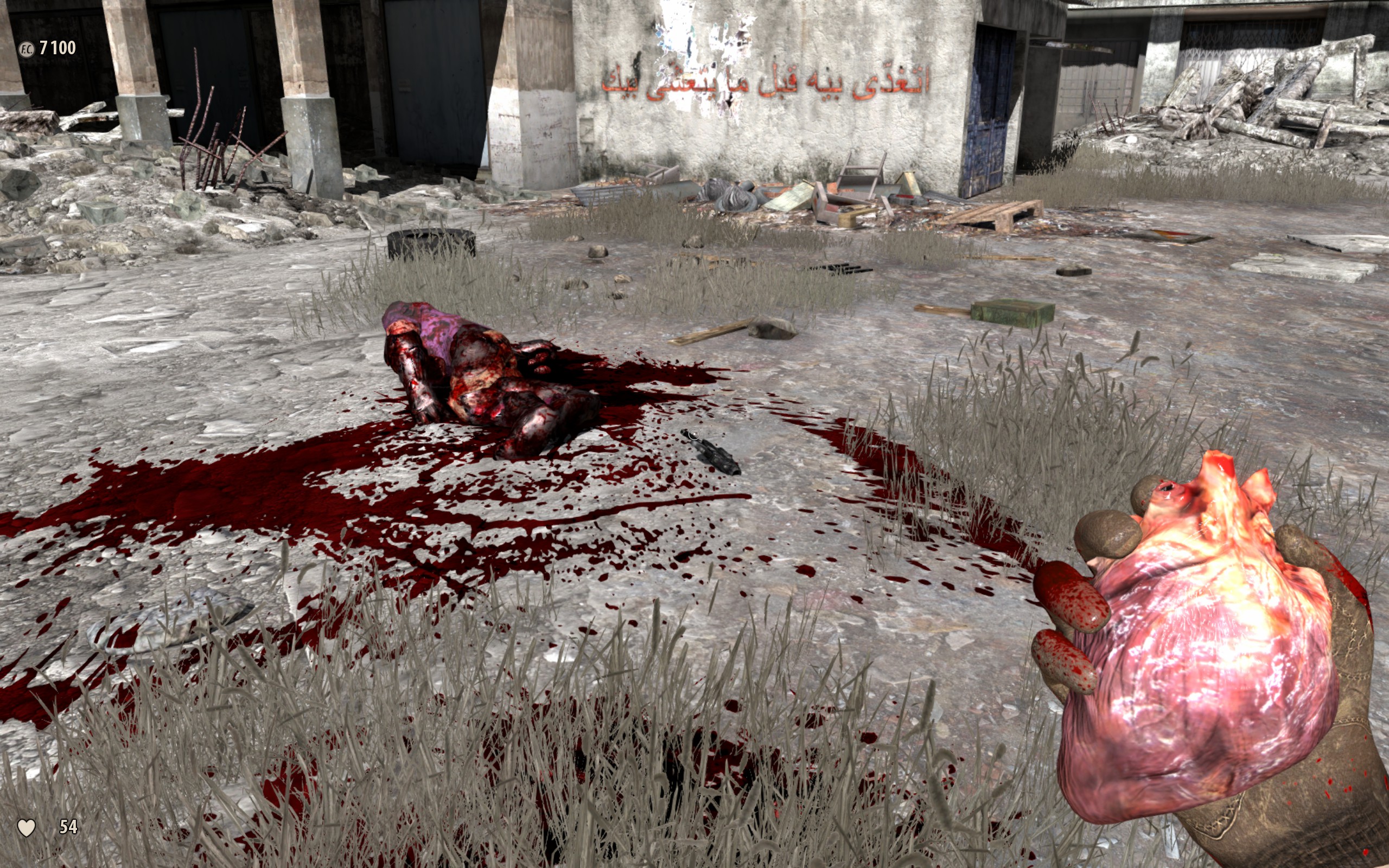 When you start feeling confident in managing these varying strategies, the game throws its first major boss at you: a huge, red, scorpion-like creature armed with machine guns for hands. This creature towers over you as you dodge it’s attacks and throw shotgun pellets into its flesh. It becomes a battle of attrition, but eventually, it dies, and you progress to the next part of your mission.