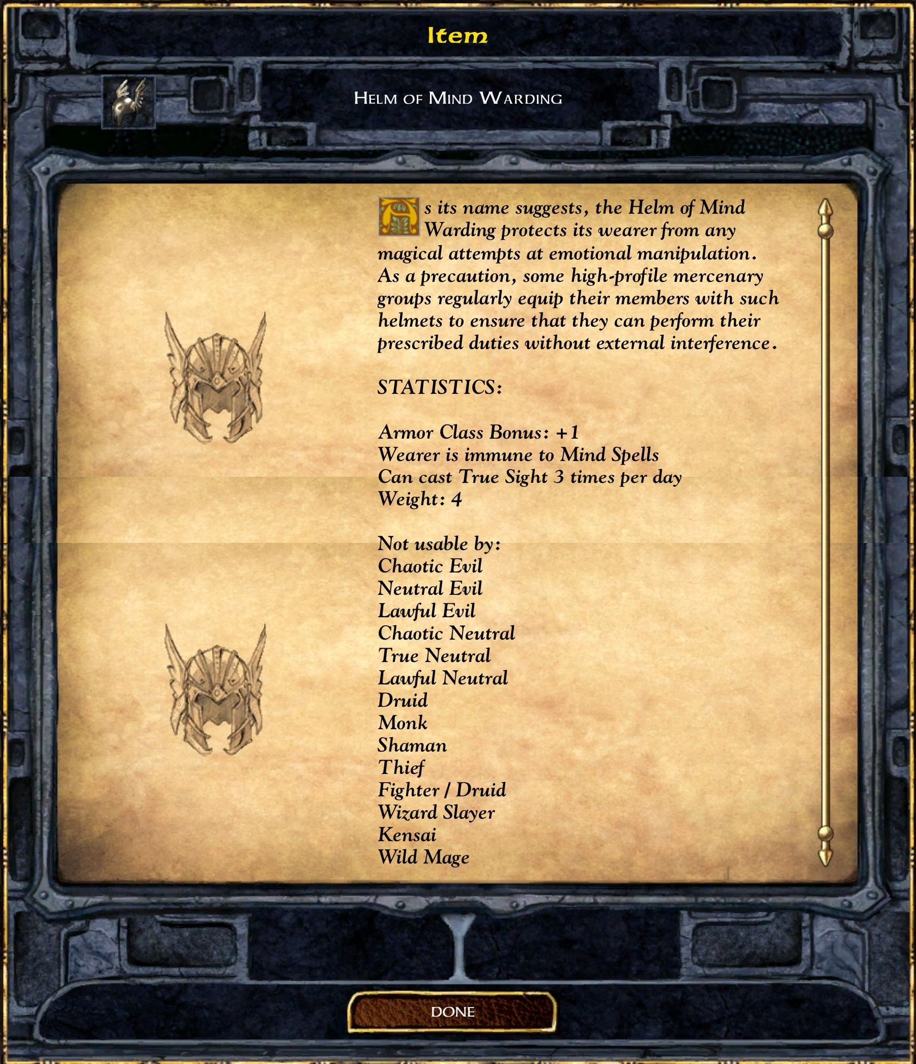 After we rest I am able to use the Weave to Identify the helmet we found in Bone Hill Castle. It’s a Helm of Mind Warding, able to protect the mind of the wearer, as well as to reveal hidden secrets. If we encounter the Shadow Thieves again, this should come in handy. For now, Minsc takes the helm and gives his Watcher’s Helm to Morwen.