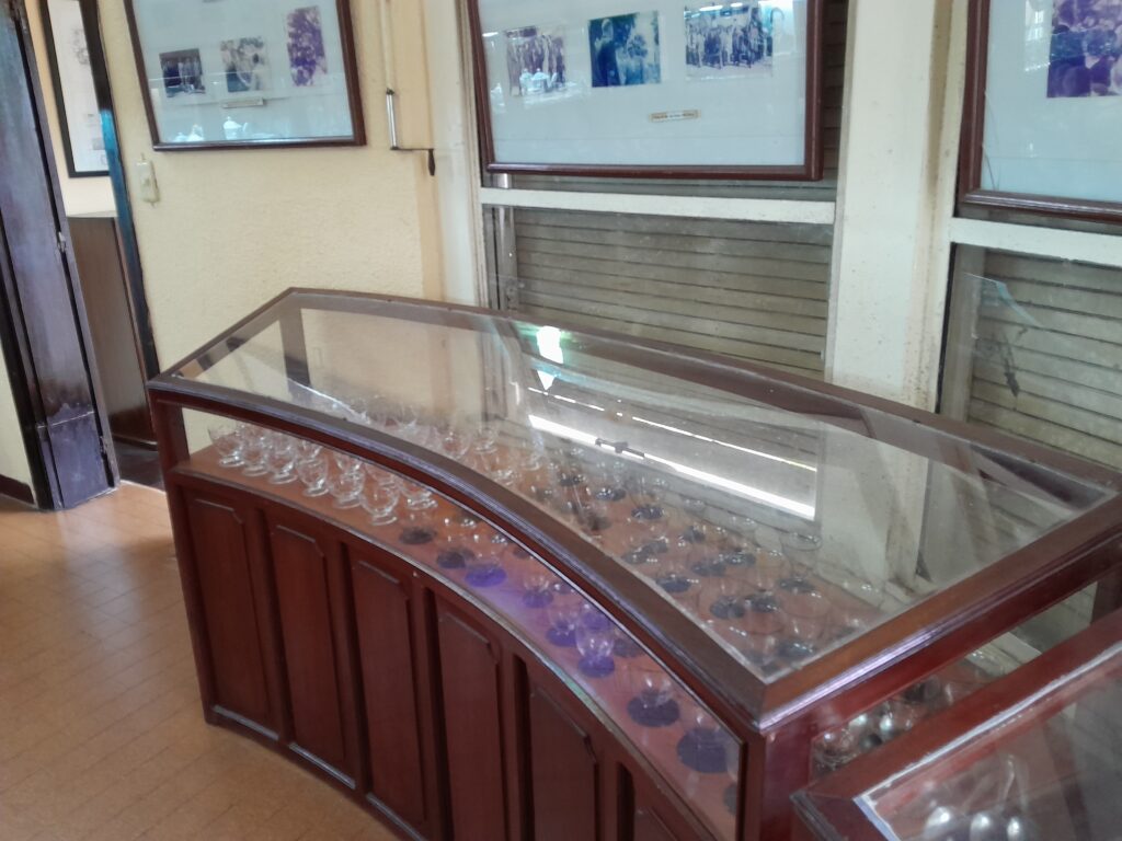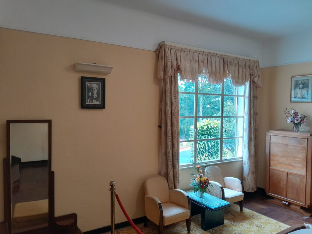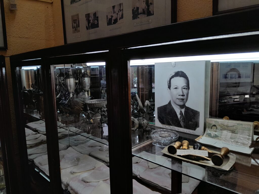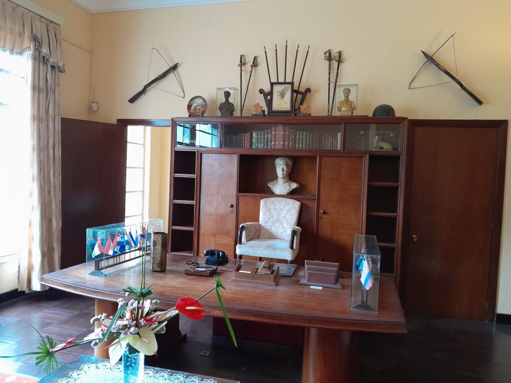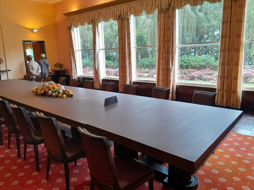 On the bottom floor there is an office displaying the flags of various nations that interact with Vietnam in one of the windows. There are also smaller flags in a glass case on the desk in this room. The office retains the setting where the Emperor would have worked during the day, a comfortable space for meetings, phone calls, or working through documents.