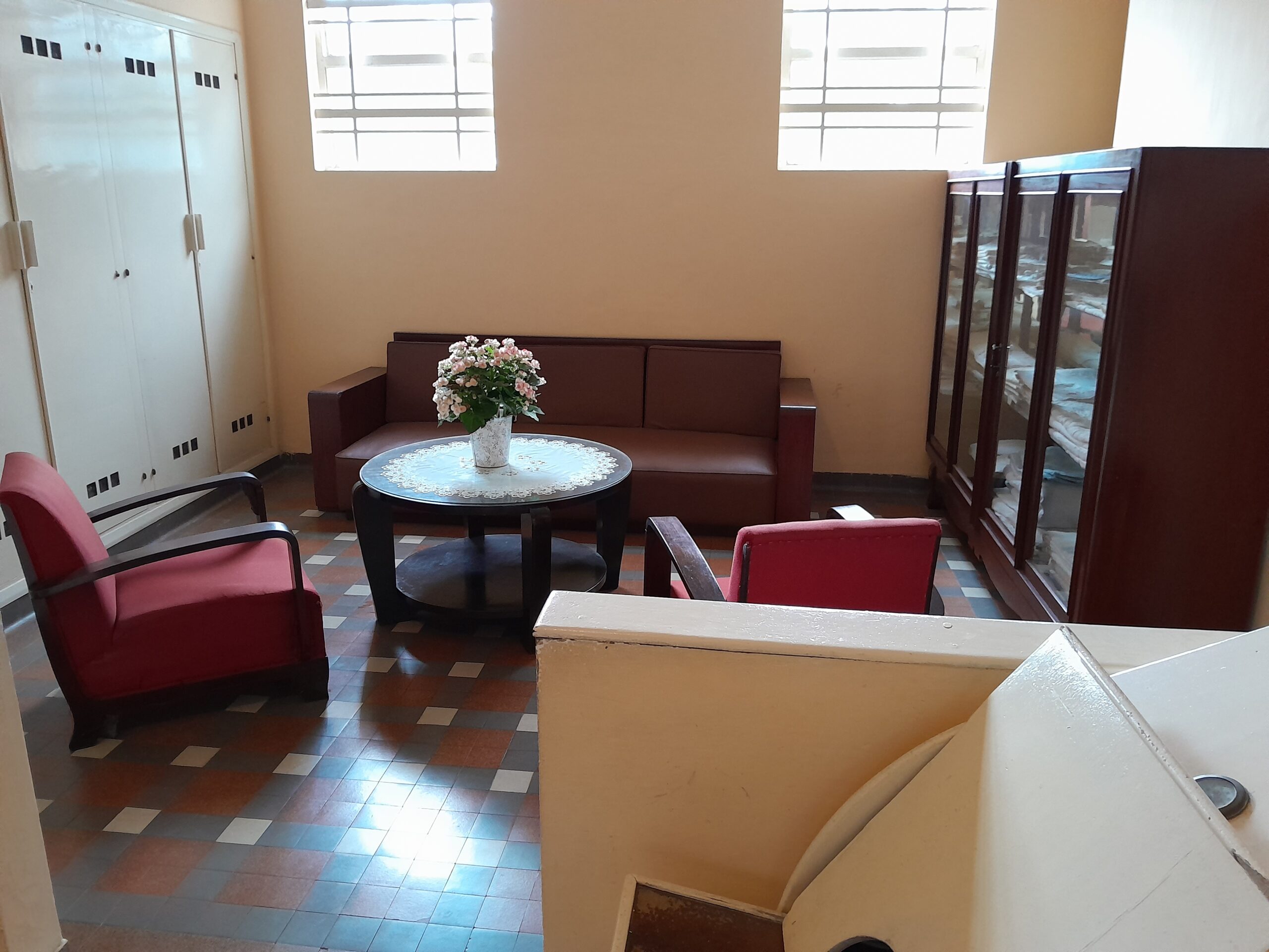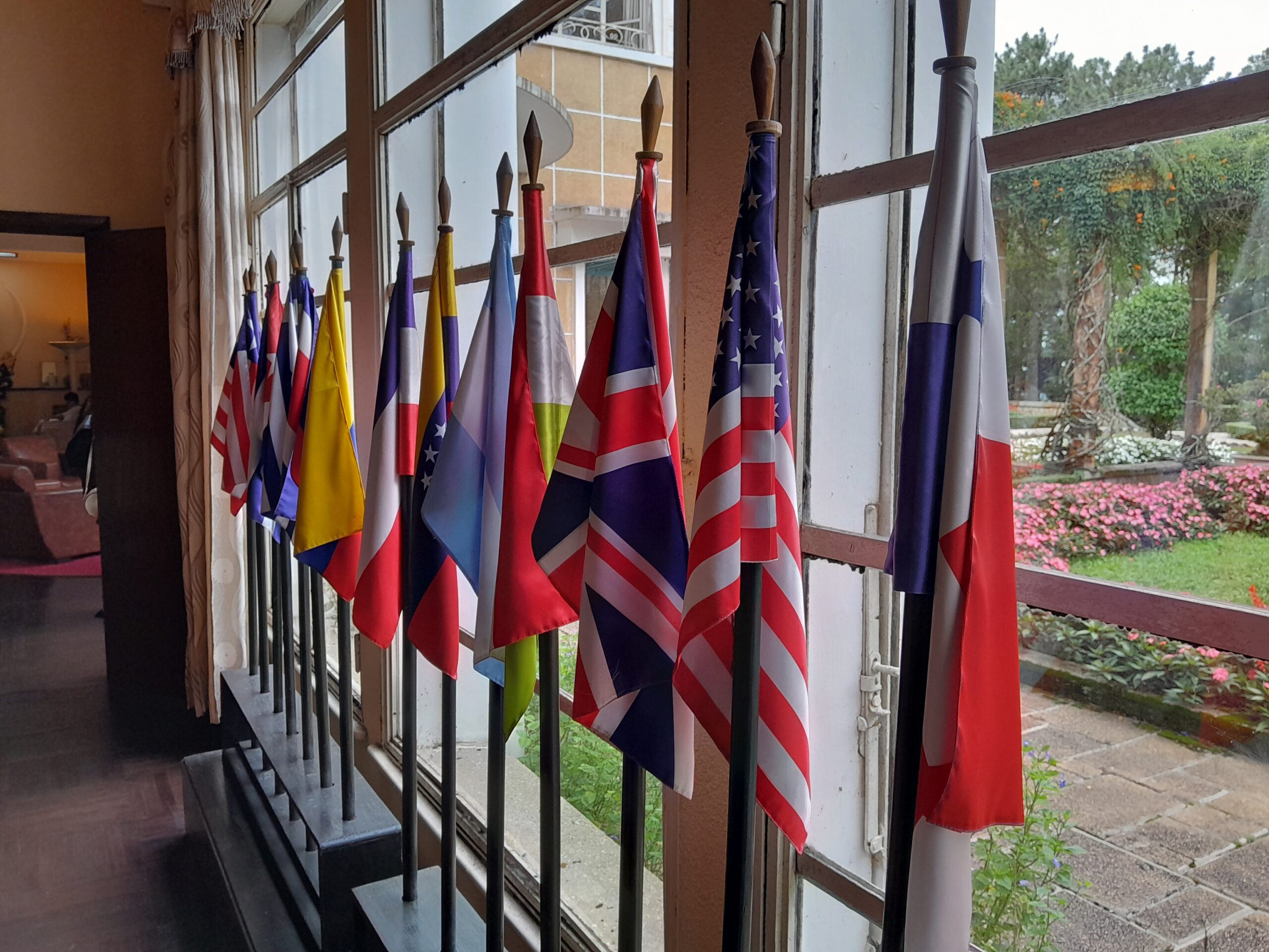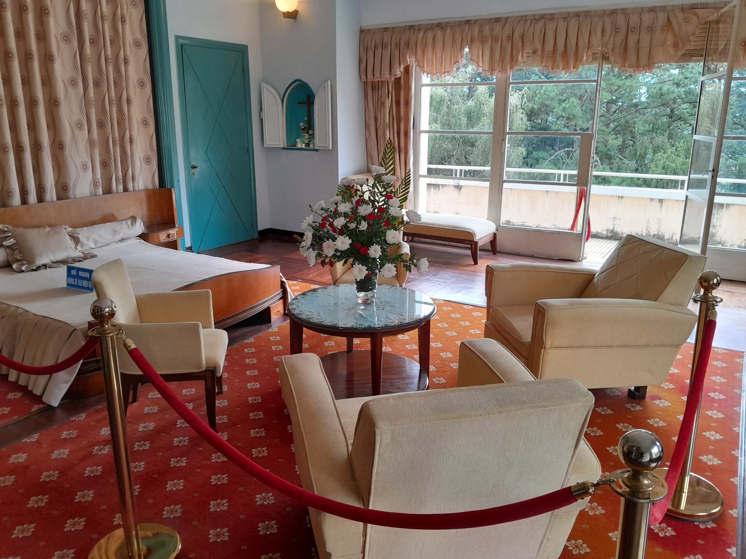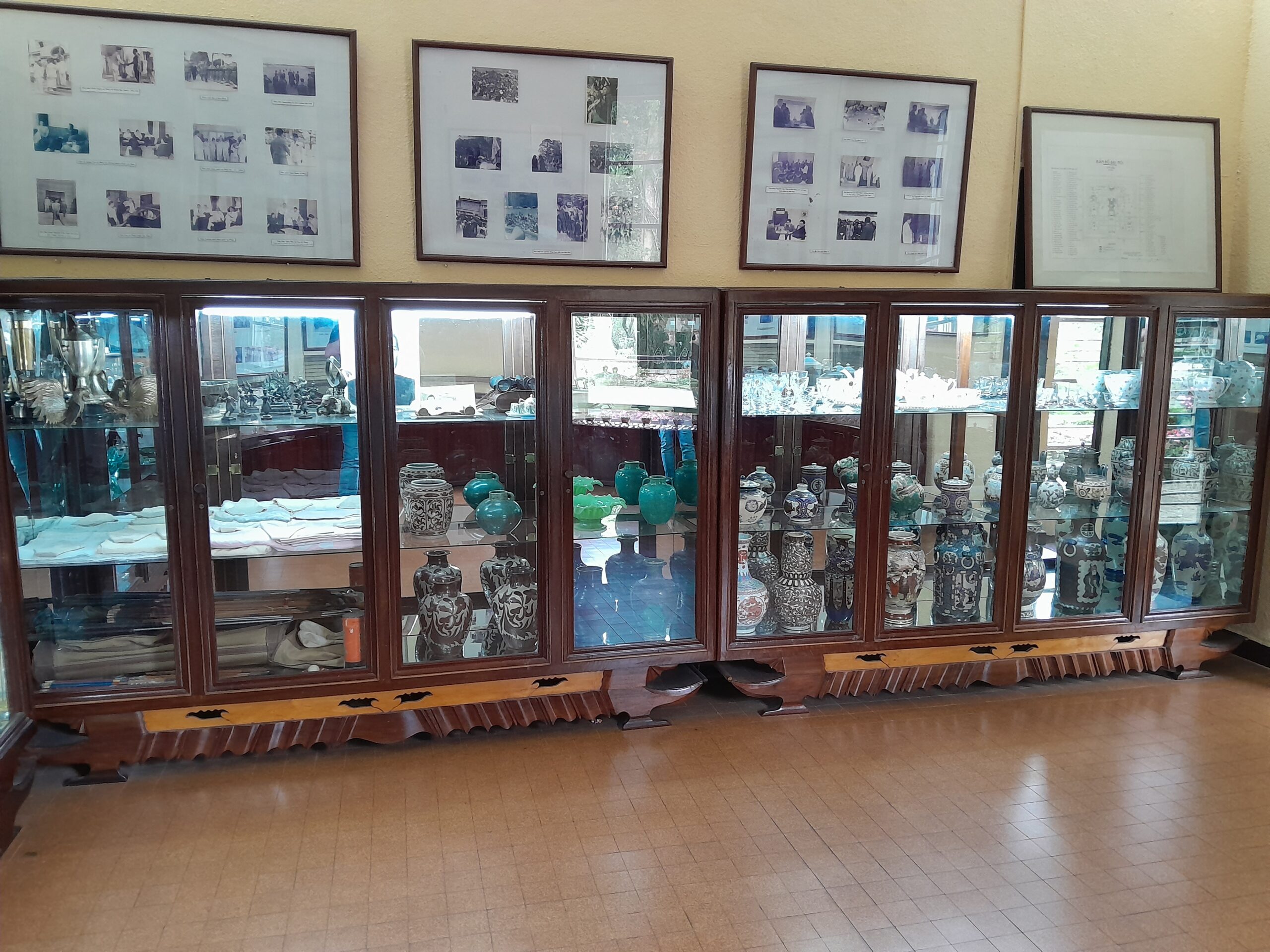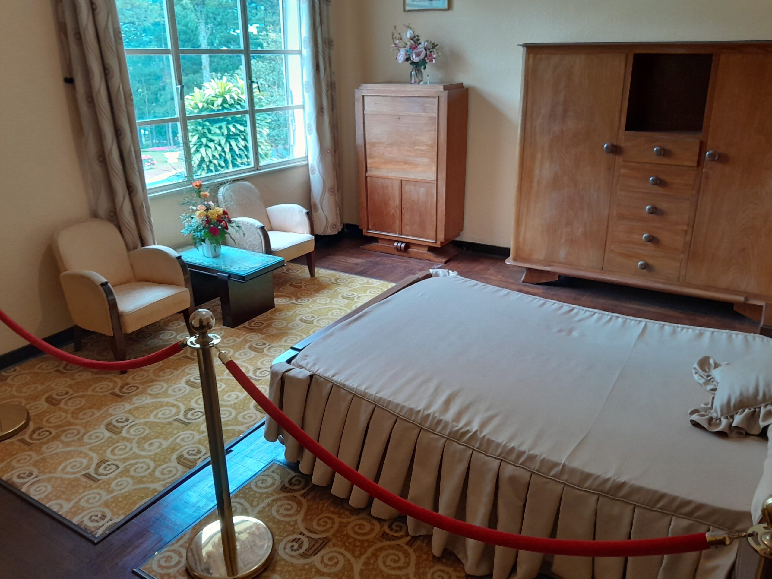 On the bottom floor there is an office displaying the flags of various nations that interact with Vietnam in one of the windows. There are also smaller flags in a glass case on the desk in this room. The office retains the setting where the Emperor would have worked during the day, a comfortable space for meetings, phone calls, or working through documents.