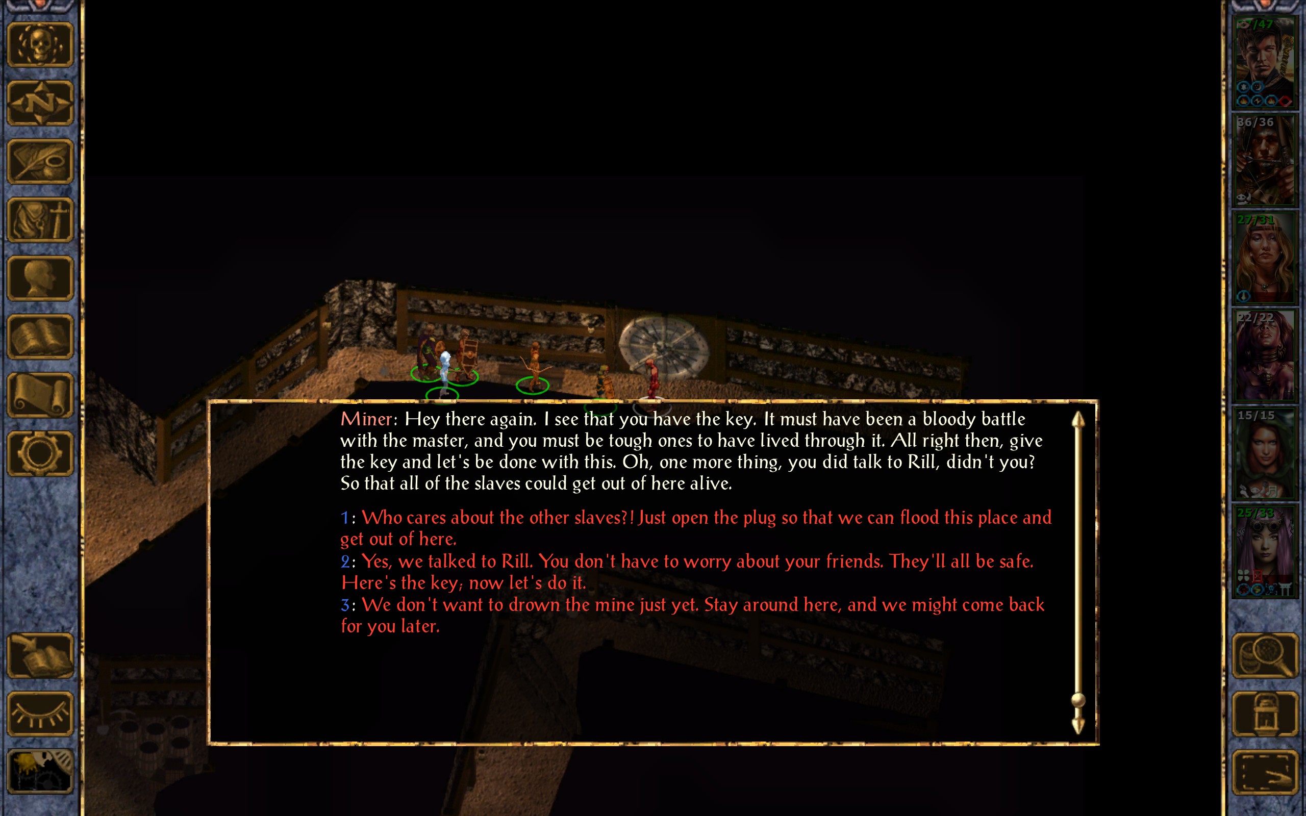 Miner: Hey there again. I see that you have the key. It must have been a bloody battle with the master, and you must be tough ones to have lived through it. All right then, give the key and let’s be done with this. Oh, one more thing, you did talk to Rill, didn’t you? So that all of the slaves could get out of here alive.