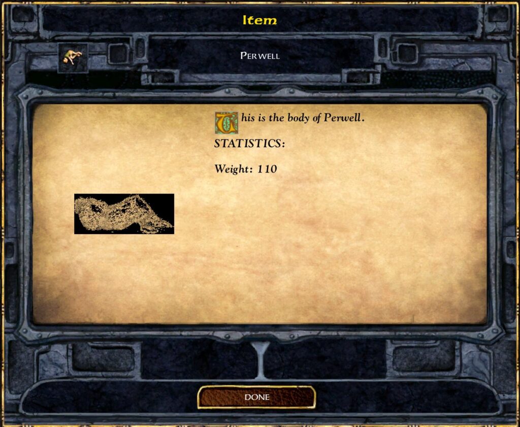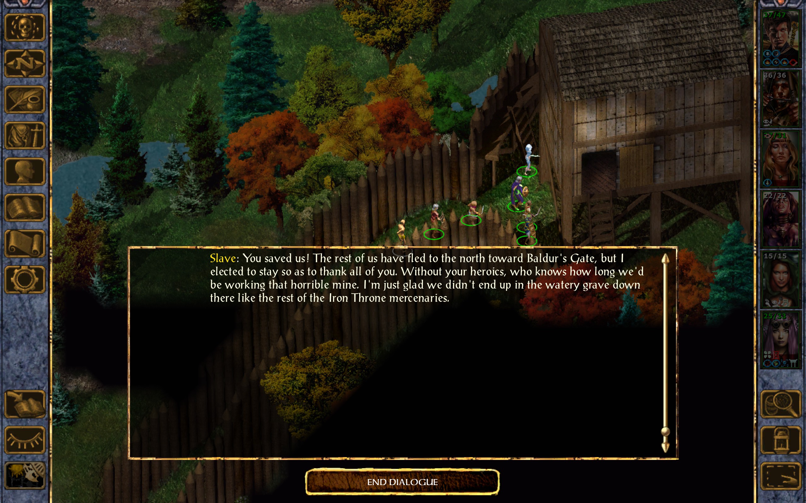 Slave: You saved us! The rest of us have fled to the north toward Baldur’s Gate, but I elected to stay so as to thank all of you. Without your heroics, who knows how long we’d be working that horrible mine. I’m just glad we didn’t end up in the watery grave down there like the rest of the Iron Throne mercenaries.