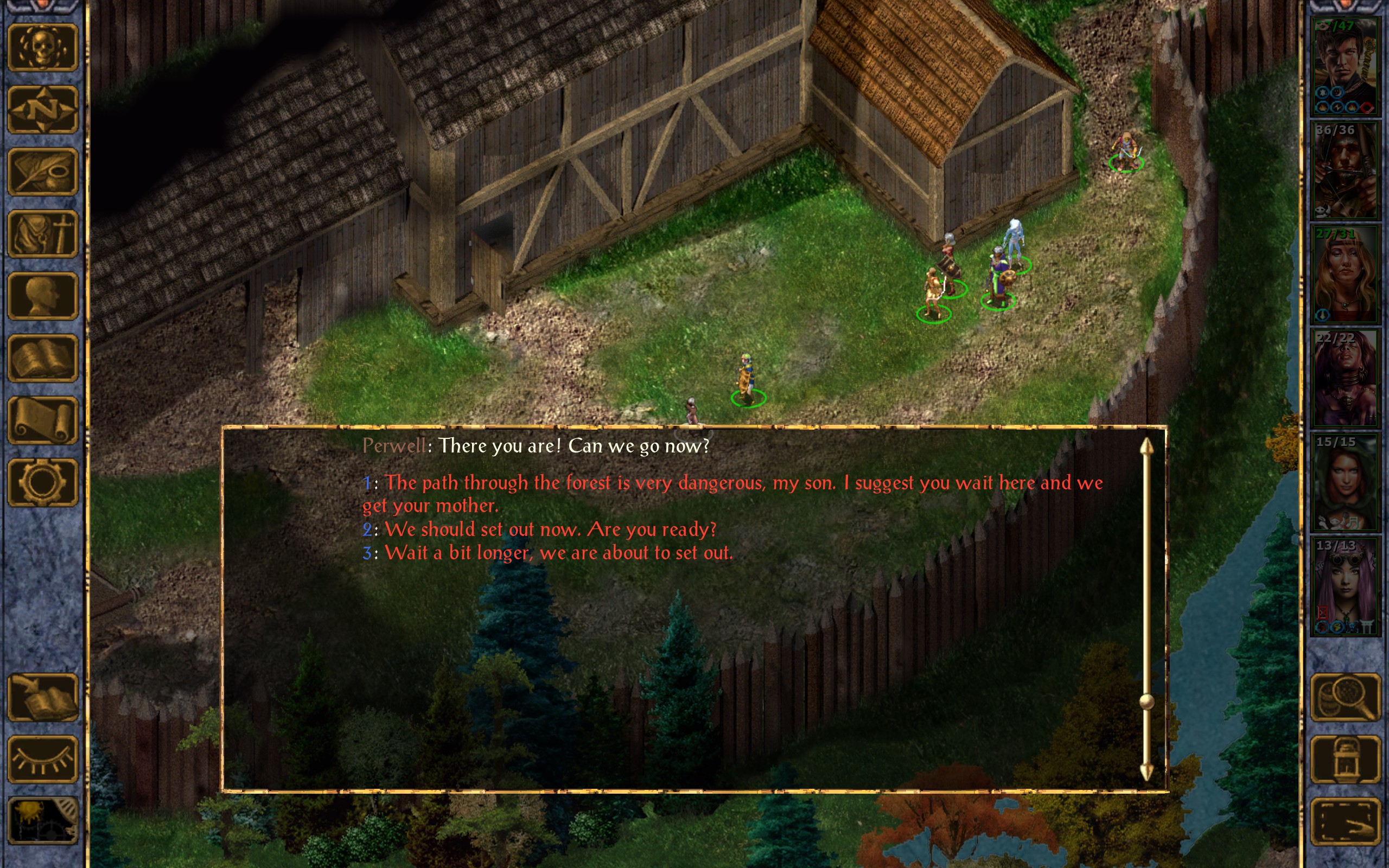 It’s dangerous out there in the wild, so we’ll have to be careful to protect the kid. We lead him across the bridge on the moat, and find a small group of druids waiting for us. Their leader, wearing surprisingly heavy armour and wielding an ornate green staff addresses us.