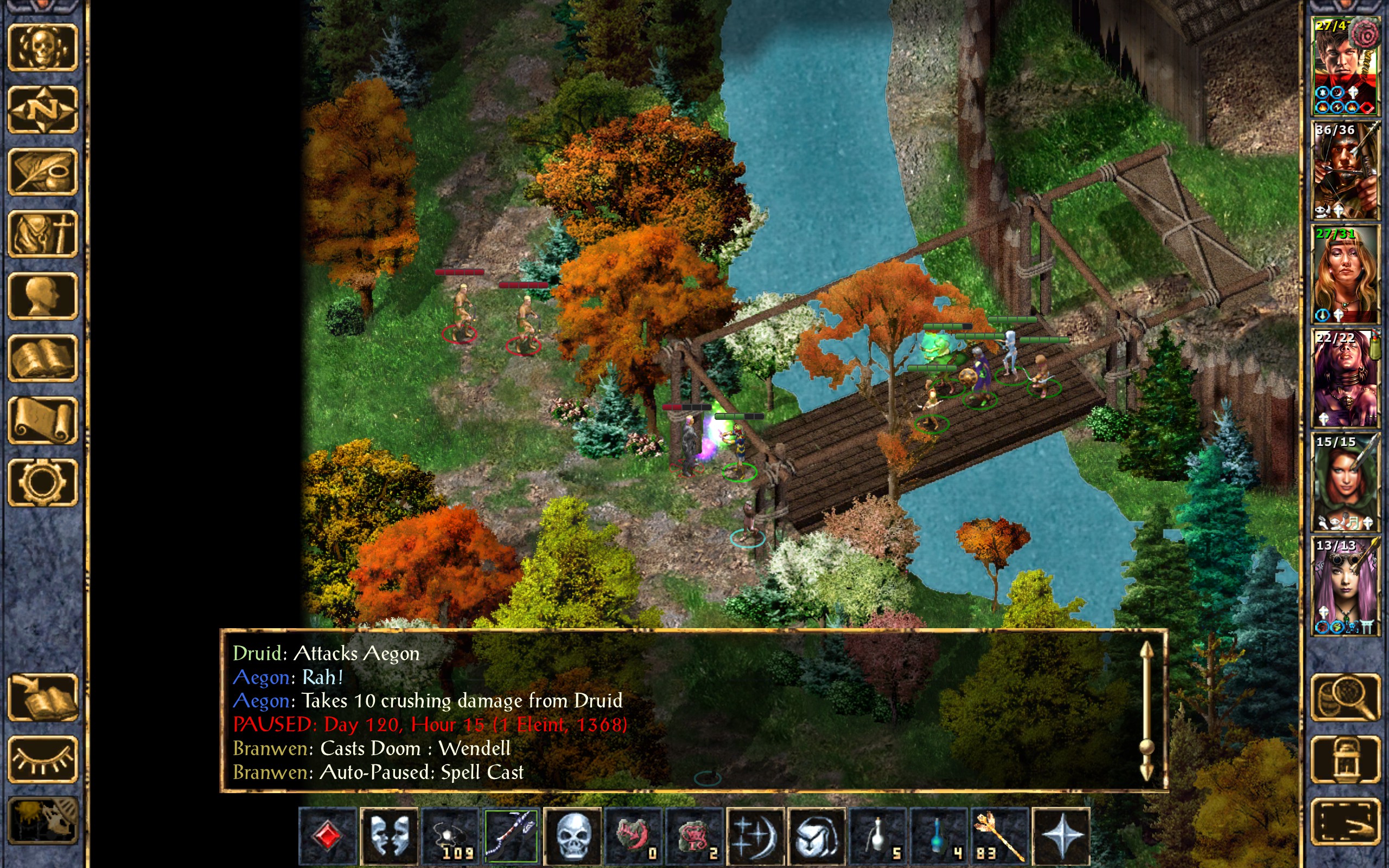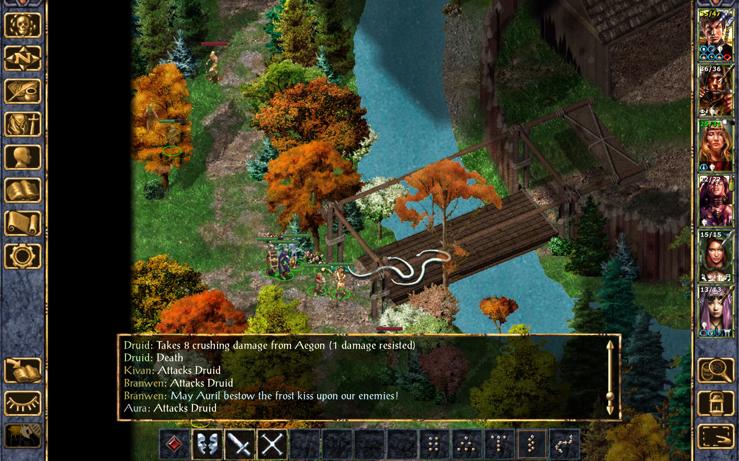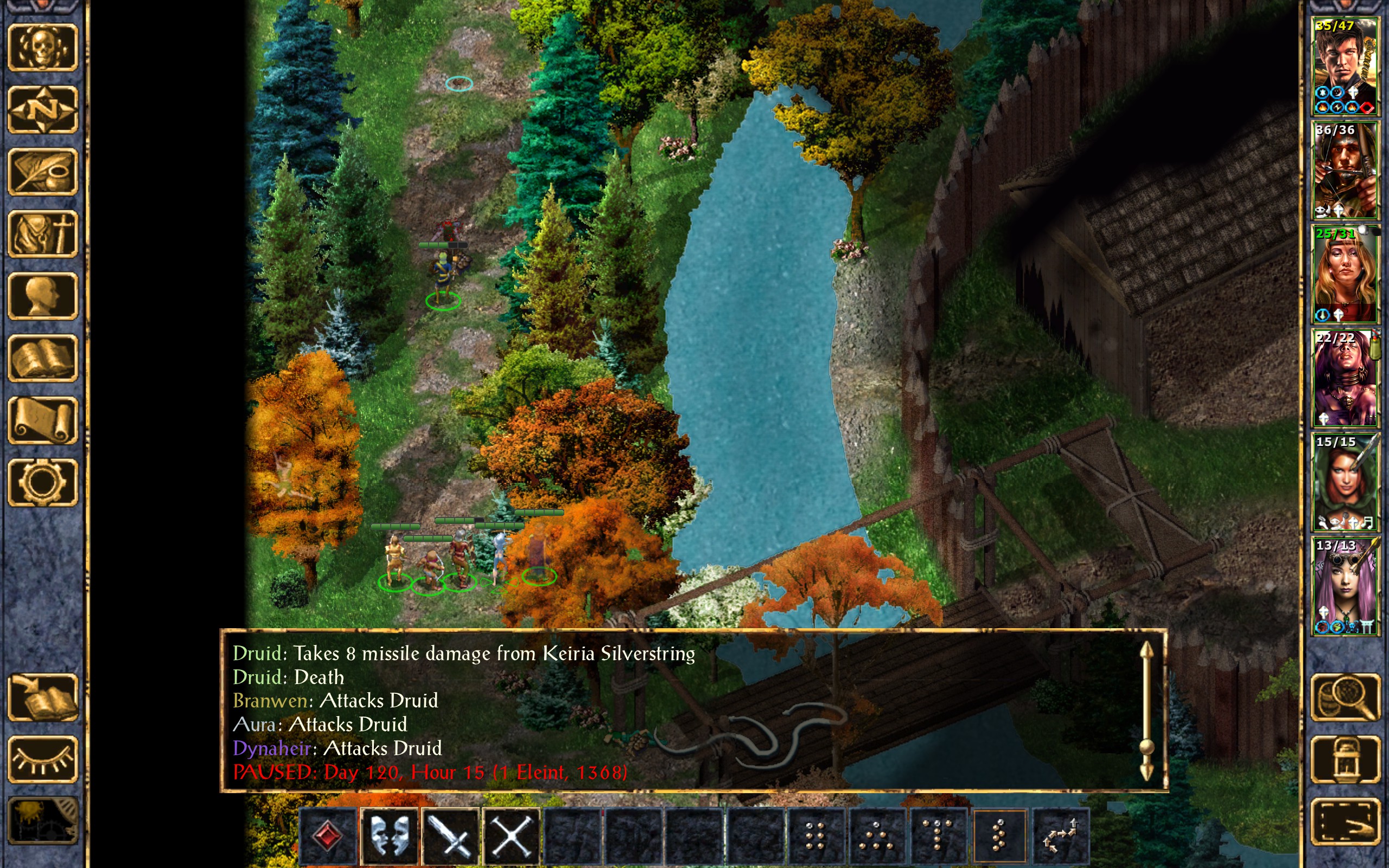 I yell at the kid to run for cover while the rest of us ready our weapons. Dynaheir attempts to Command the lead druid to lie down, but his will is too strong.
