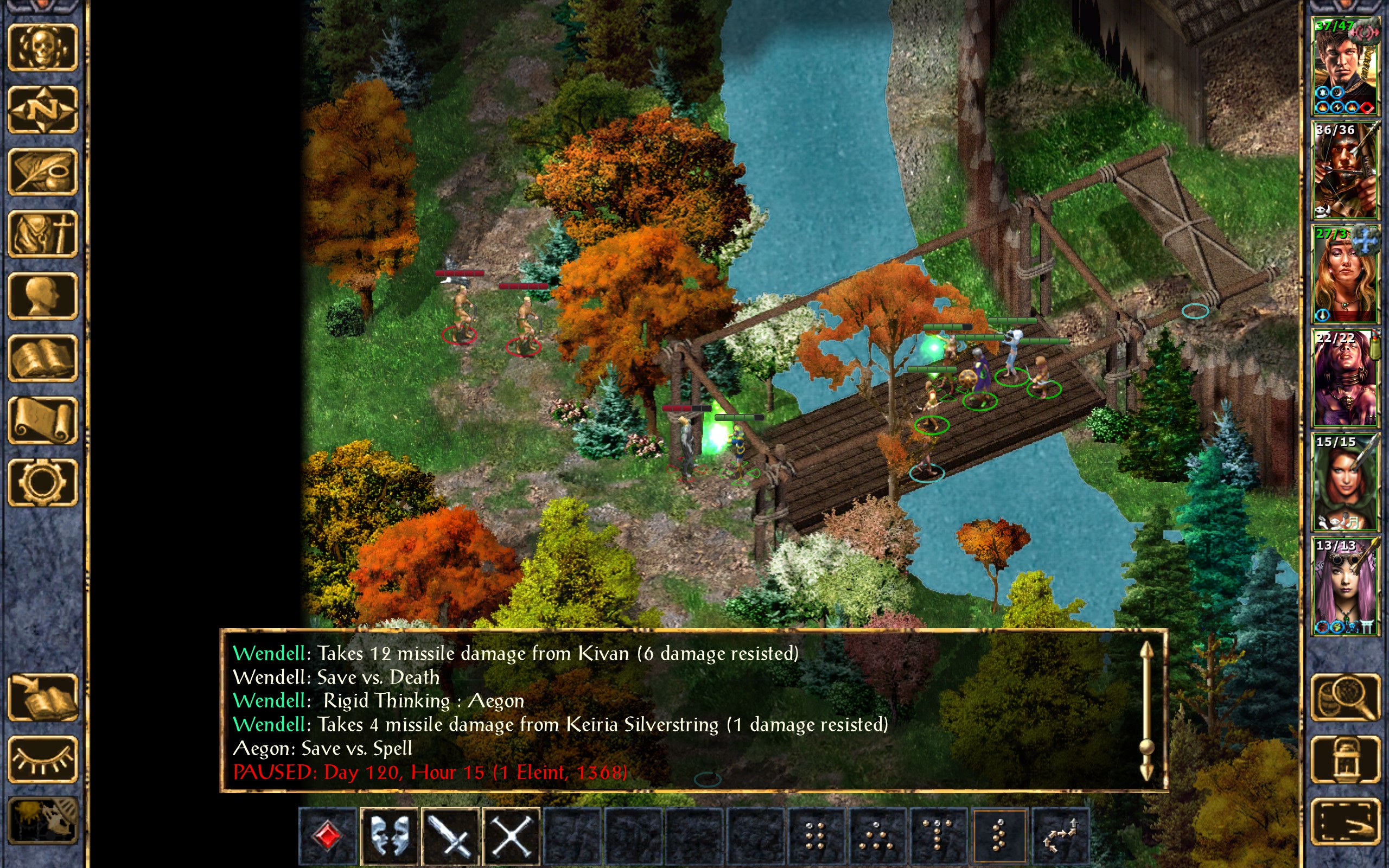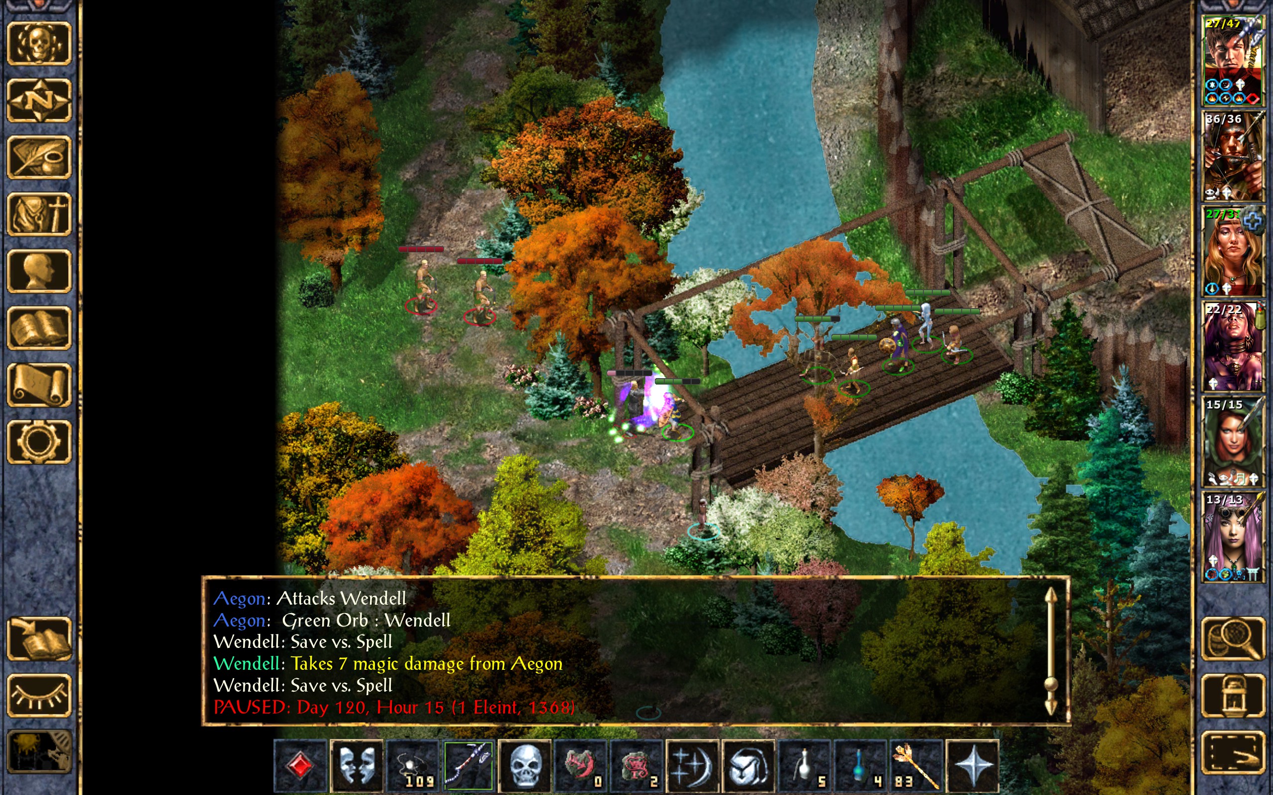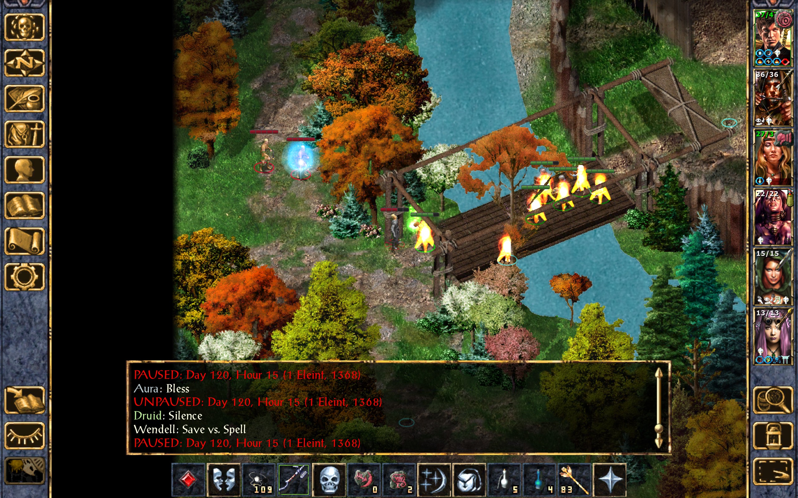 I yell at the kid to run for cover while the rest of us ready our weapons. Dynaheir attempts to Command the lead druid to lie down, but his will is too strong.