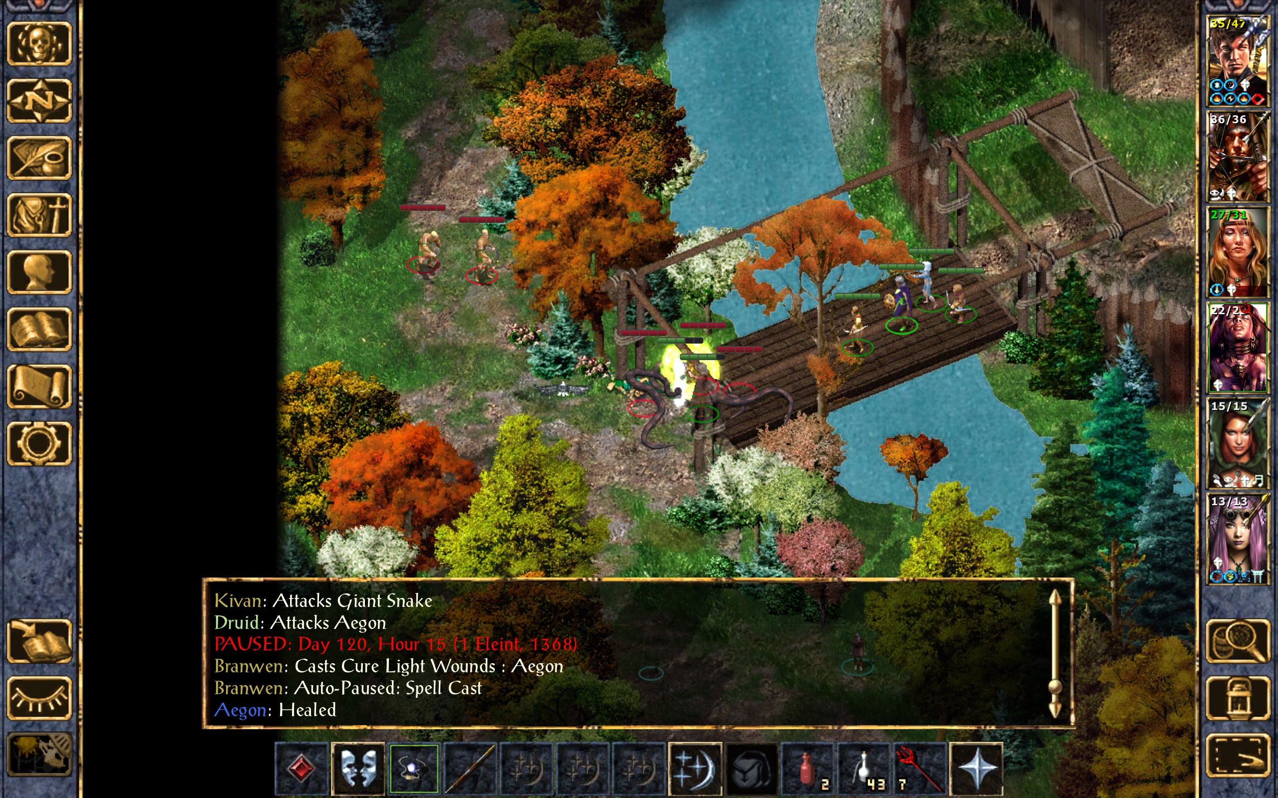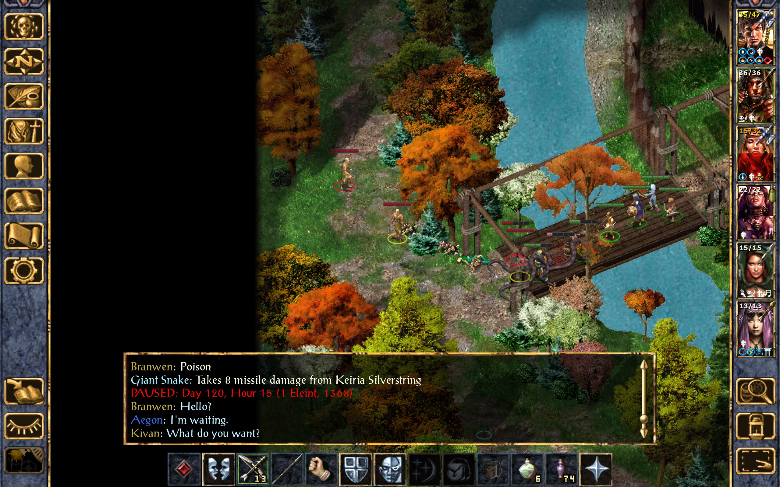 Dynaheir raises her Wand of Fear and utters the command word. One of the snakes and one of the druids panic and flee from the bridge and the fight.
