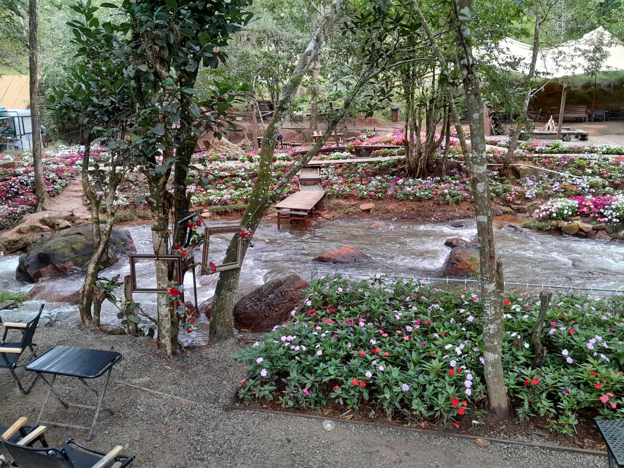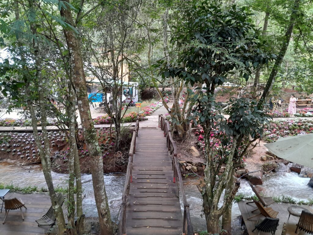 Inside you will find a small river surrounded by carefully placed rocks and trees. Wooden bridges span the river, many leading to secluded spots where you can sit down and enjoy some Vietnamese coffee or ice cream.